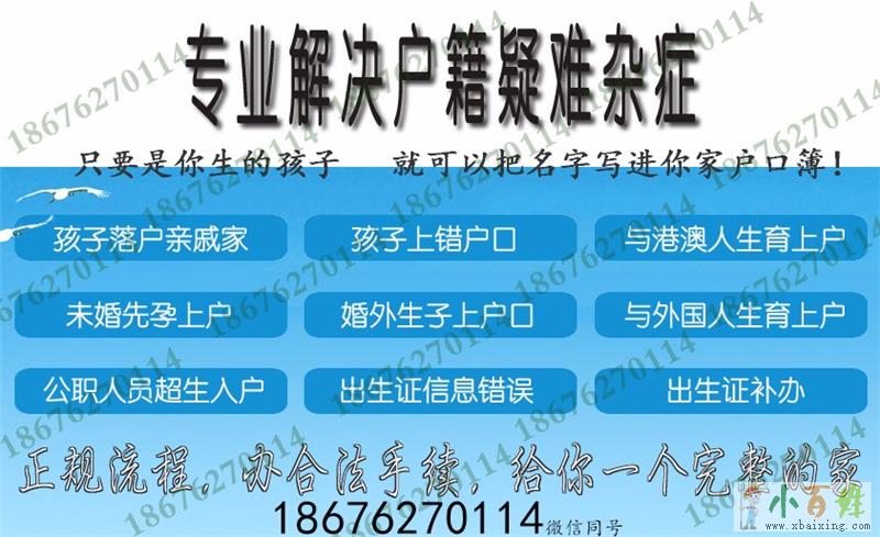 我们是专业解决全国疑难杂症户籍问题,类似非婚生育上户口、婚外生子女上户口、无户口上户口、无出生证明上户口等,我们也是解决了很多,而且我们的朋友圈真是案例也是得到客户满意的反馈。主要孩子是您亲生的,我们都有办法帮助孩子上户口到您的名下,欢迎免费咨询邹老师。小百姓网www.xbaixing.comxuIX